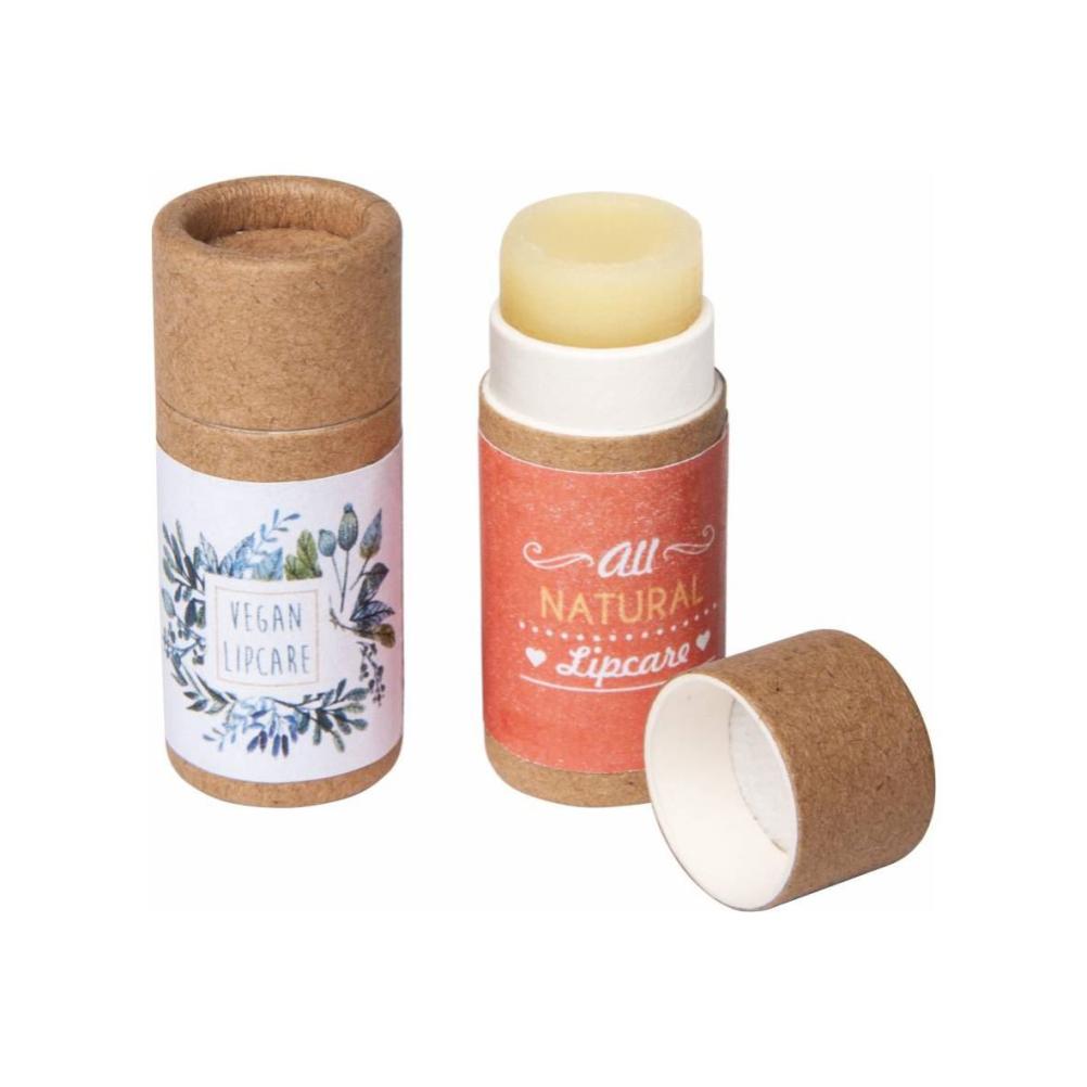 Lip balm in an ecological push-up container made of FSC certified cardboard. This environmentally sound, vegan lip balm tube does not contain any plastic and is compostable. It is finished with a full colour paper label. From 10.000 pcs also with direct printing.